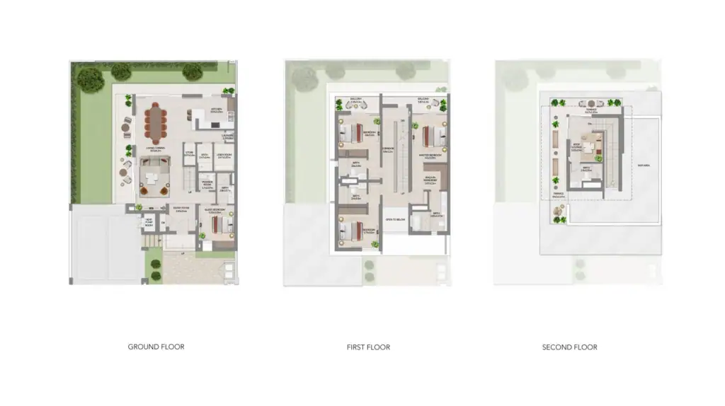 All units are 4 bedroom villas sized between 3,638 and 3,832 sq ft, with gardens, terraces, and rooftop areas.